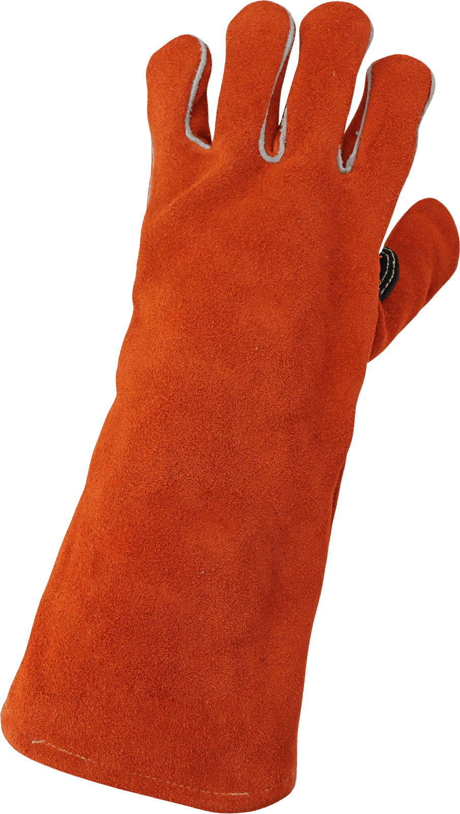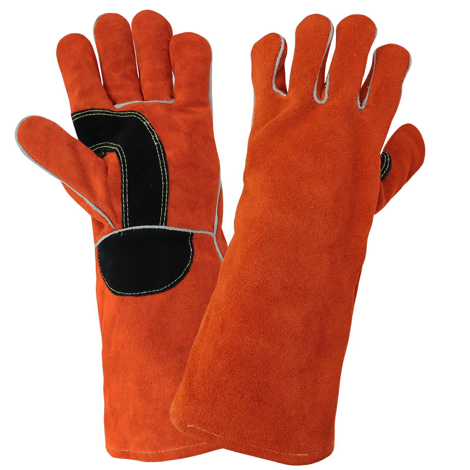 Guantes de soldador Fabricado con piel de vaca de alta calidad de 16” de largo, resistente al calor. Color rojo/naranja y costuras de hilo de aramida. Pulgar y palma reforzados con carnaza color negro. Forro de algodón para comodidad, transpirabilidad y mayor protección.