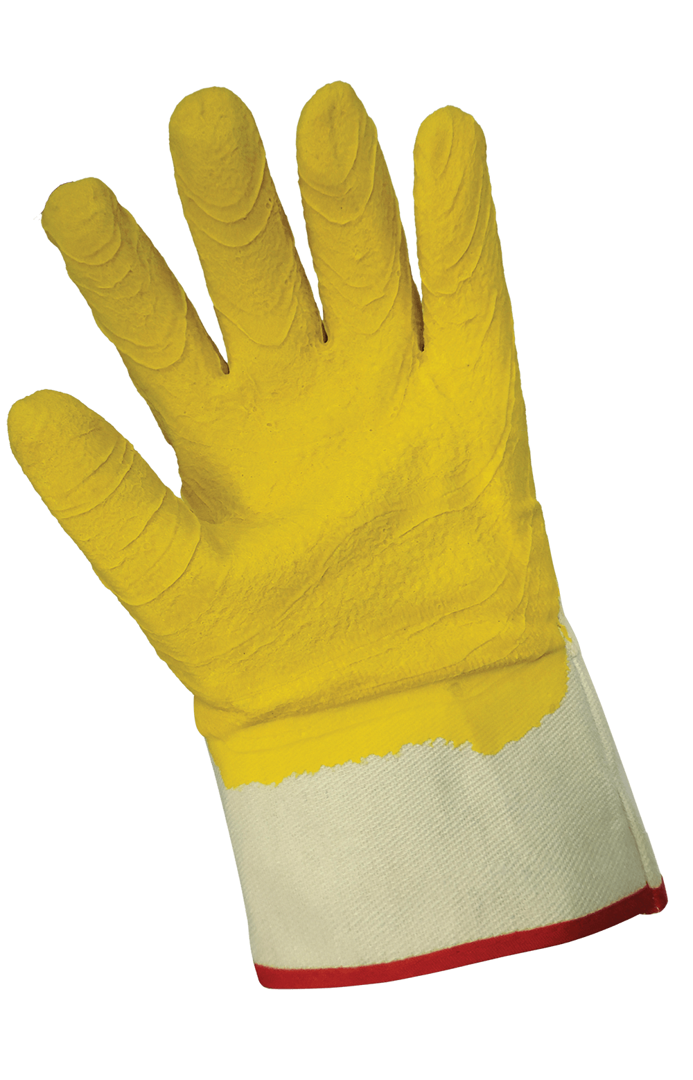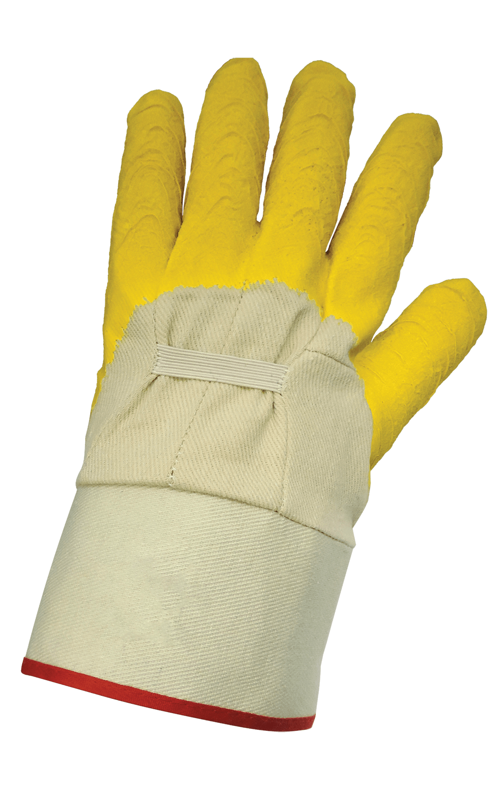 Estos guantes económicos están confeccionados con 5 piezas de lona de algodón de color natural con una capa de goma de tres cuartos con acabado arrugado y un puño de seguridad engomado.