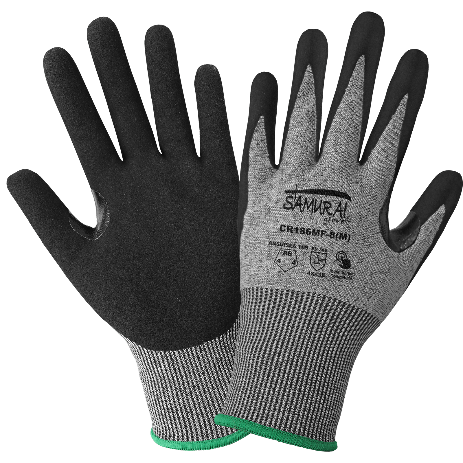 Guante resistente a cortes sin costuras cuenta con una cubierta de fibra HPPE de calibre 13 color sal y pimienta. La cubierta está reforzada por una palma bañada en nitrilo laminado. Un puño de punto proporciona un ajuste cómodo y seguro.