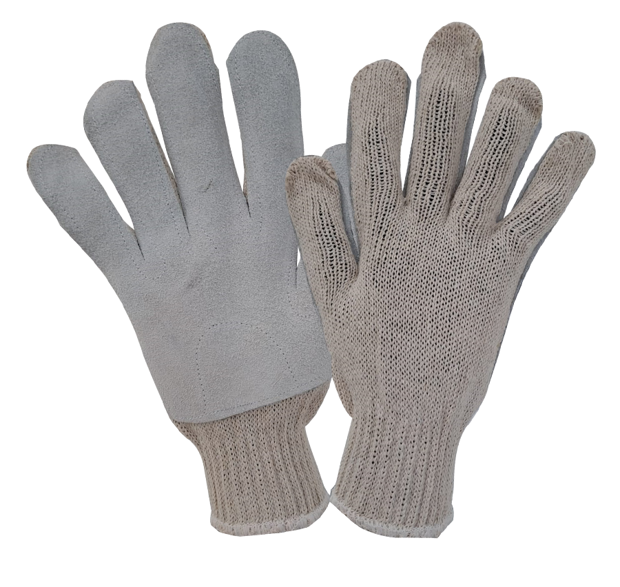 Guante japonés de uso general confeccionado en algodón de color natural calibre 8. Cuenta con una palma de carnaza cosida y pegada con hilo de algodón, y un puño tejido con ribete.